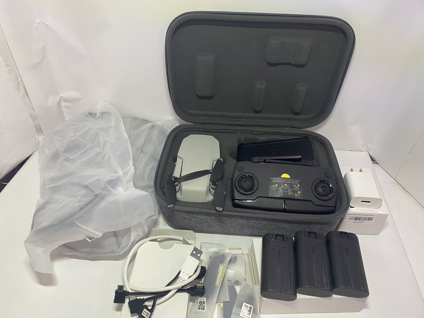 [付属] 外箱、送信機、バッテリーx3、プロペラ1組(予備)、MicroUSBケーブル、ジンバルプロテクター、MicroUSBコネクター、USBType-Cコネクター、Lightning コネクター、コントロールスティック1組(予備)、ねじ(予備)、ねじ回し、ACアダプタ、キャリーバッグ